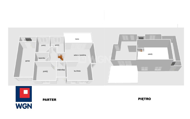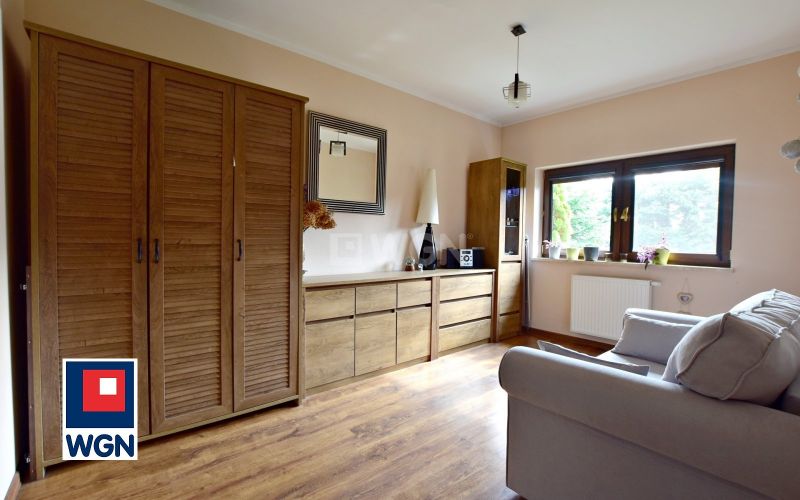Na parterze znajdują się wiatrołap, przestronny przedpokój, salon z jadalnią i kuchnią o powierzchni 45 m2 i wyjściem na duży taras z widokiem na ogród, 3 komfortowe sypialnie, łazienka z wc i kabiną prysznicową. Na piętrze znajduje się duży pokój, który doskonale sprawdzi się jako sypialnia, pokój gościnny lub domowe biuro .